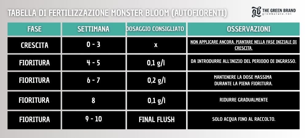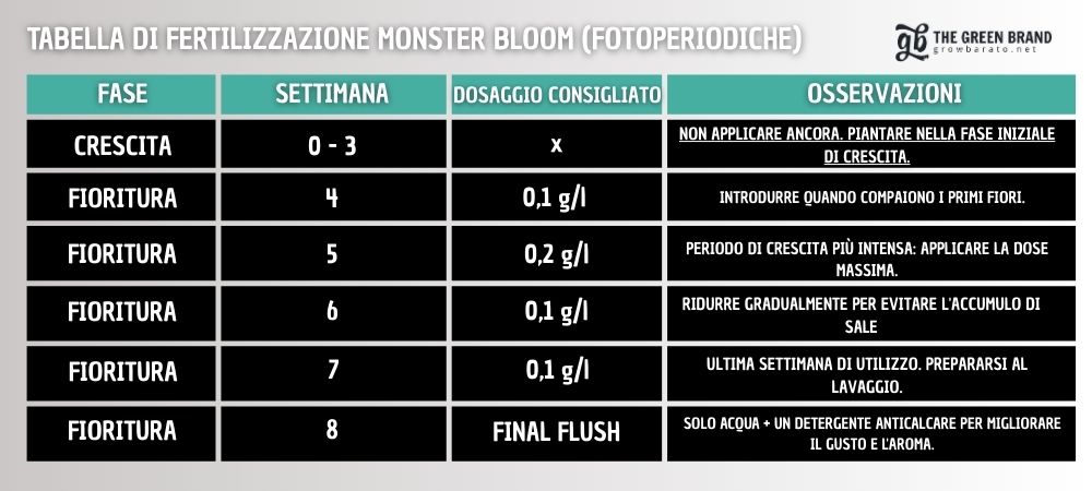 La chiave per sfruttare al massimo Monster Bloom è seguire la Tabella di fertilizzazione ufficiale, applicando la dose giusta al momento giusto. Un eccesso di prodotto può saturare le radici e compromettere la salute della pianta, mentre un’applicazione corretta garantisce risultati spettacolari in termini di densità, peso e qualità delle cime.